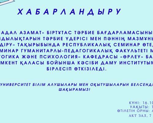 Ағымдағы жылдың 2 қазаны күні ғылыми-әдістемелік семинардың кезекті отырысы болып өтті. Аталған семинарда Шыршық мемлекеттік педагогикалық университетінен келген қонағымыз PhD, доцент Е. Кененбаев «Эволюция средств коммуникации на материале виртуального коммуникативного […]