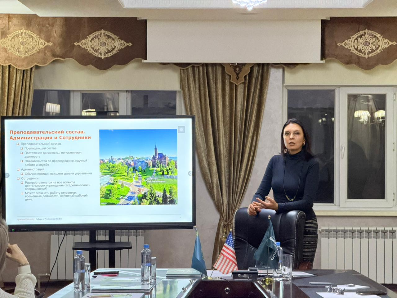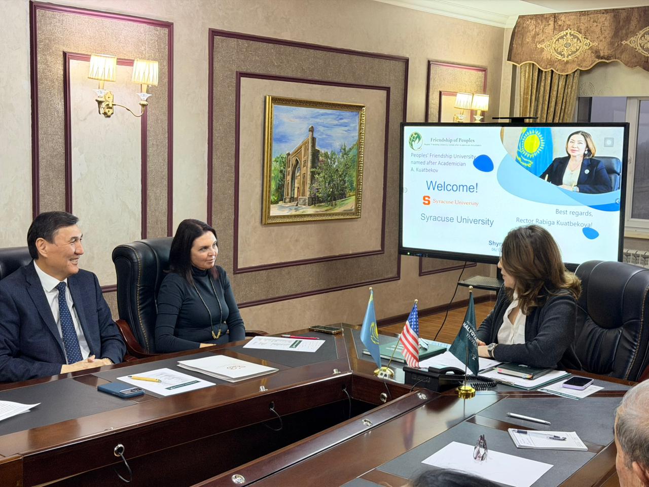 Академик Ә.Қуатбеков атындағы Халықтар достығы университетінде Сиракьюс университетінің (Сиракьюз қ, Нью-Йорк штаты, АҚШ) Академиялық бағдарламалар жөніндегі директордың орынбасары, EAP/ESP курстарын басқарушы Оганесян Ольга және Түркістан облысының Білім басқармасы басшысы міндетін атқарушы Ғалымжан Орыновпен ресми кездесу өтті.